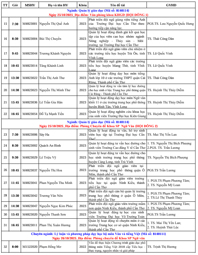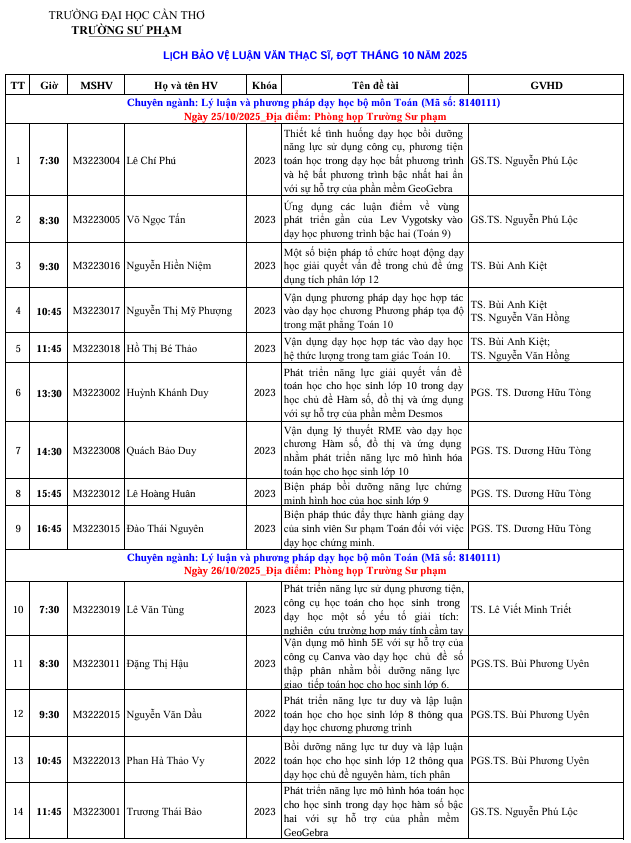 Thông báo Lịch bảo vệ Luận văn Thạc sĩ, đợt 1 tháng 10 năm 2025