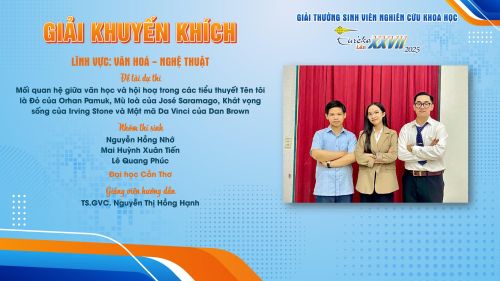 Ngày 02/12/2025, TM. Ban chấp hành Đoàn Thanh niên Cộng sản Hồ Chí Minh Thành phố Hồ Chí Minh, ông Nguyễn Thanh Hải ký tặng Bằng khen cho sinh viên/nhóm sinh viên và người hướng dẫn có đề tài đạt giải khuyến khích Giải thưởng sinh viên nghiên cứu khoa học – Euréka lần thứ 27 năm 2025. Theo đó, đề tài Mối quan hệ giữa văn học và hội họa trong các tiểu thuyết Tên tôi là Đỏ của Orhan Pamuk, Mù lòa của José Saramago, Khát vọng sống của Irving Stone và Mật mã Da Vinci của Dan Brown của sinh viên Nguyễn Hồng Nhớ (Chủ nhiệm), Mai Huỳnh Xuân Tiến, Lê Quang Phúc (sinh viên K47 ngành Sư phạm Ngữ văn, Trường Sư phạm, Đại học Cần Thơ) đạt giải khuyến khích. Thông tin đề tài: