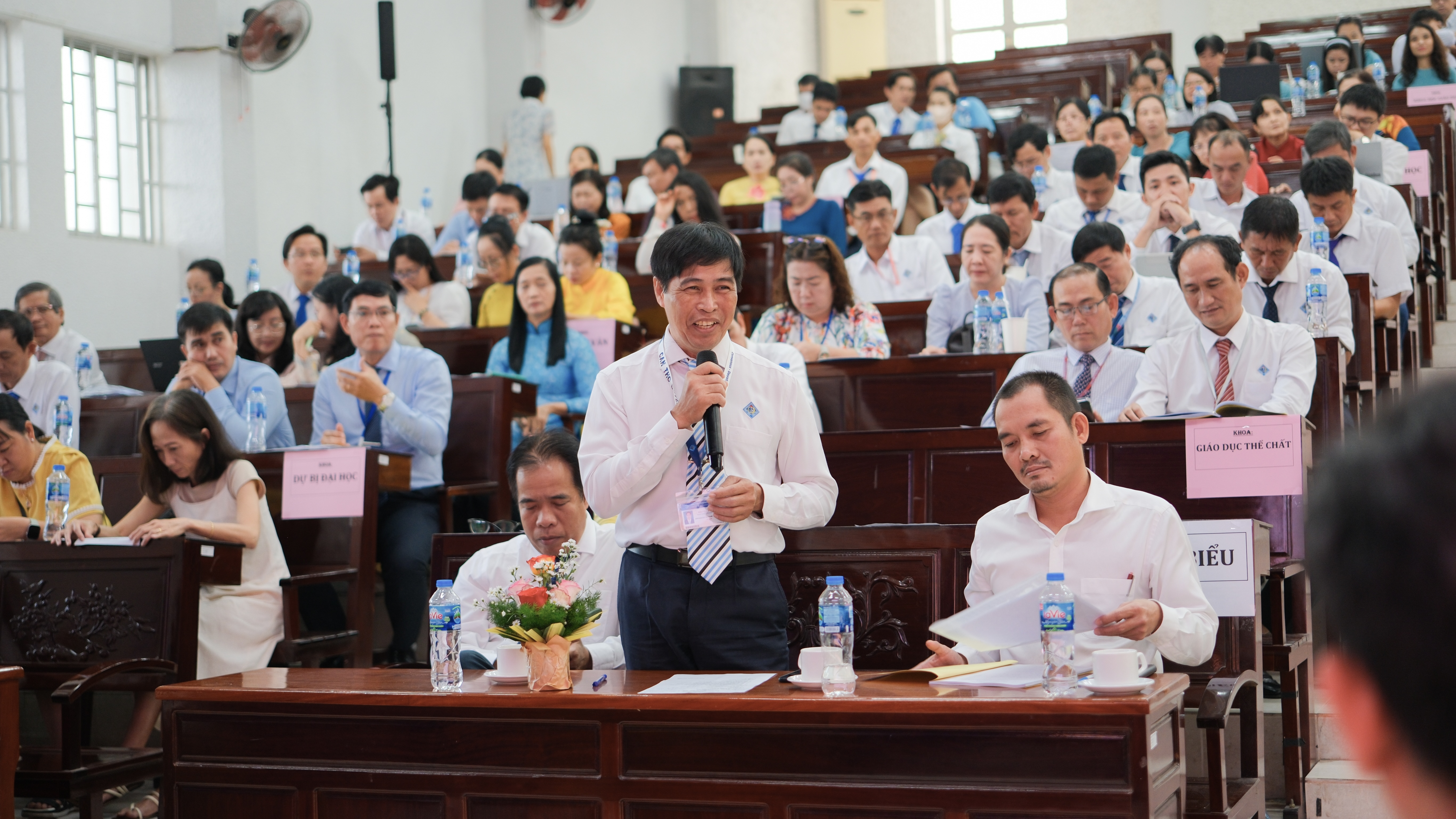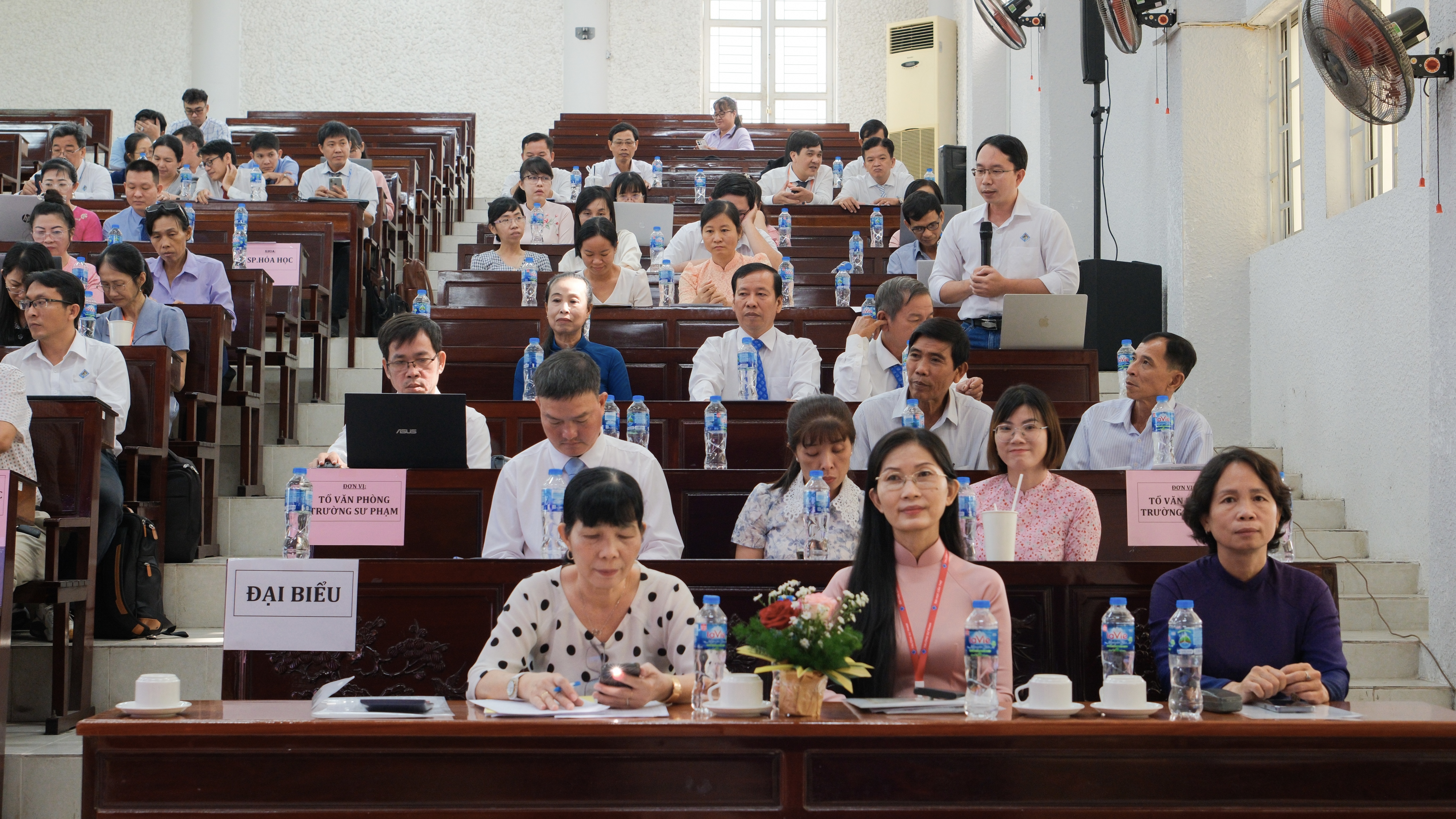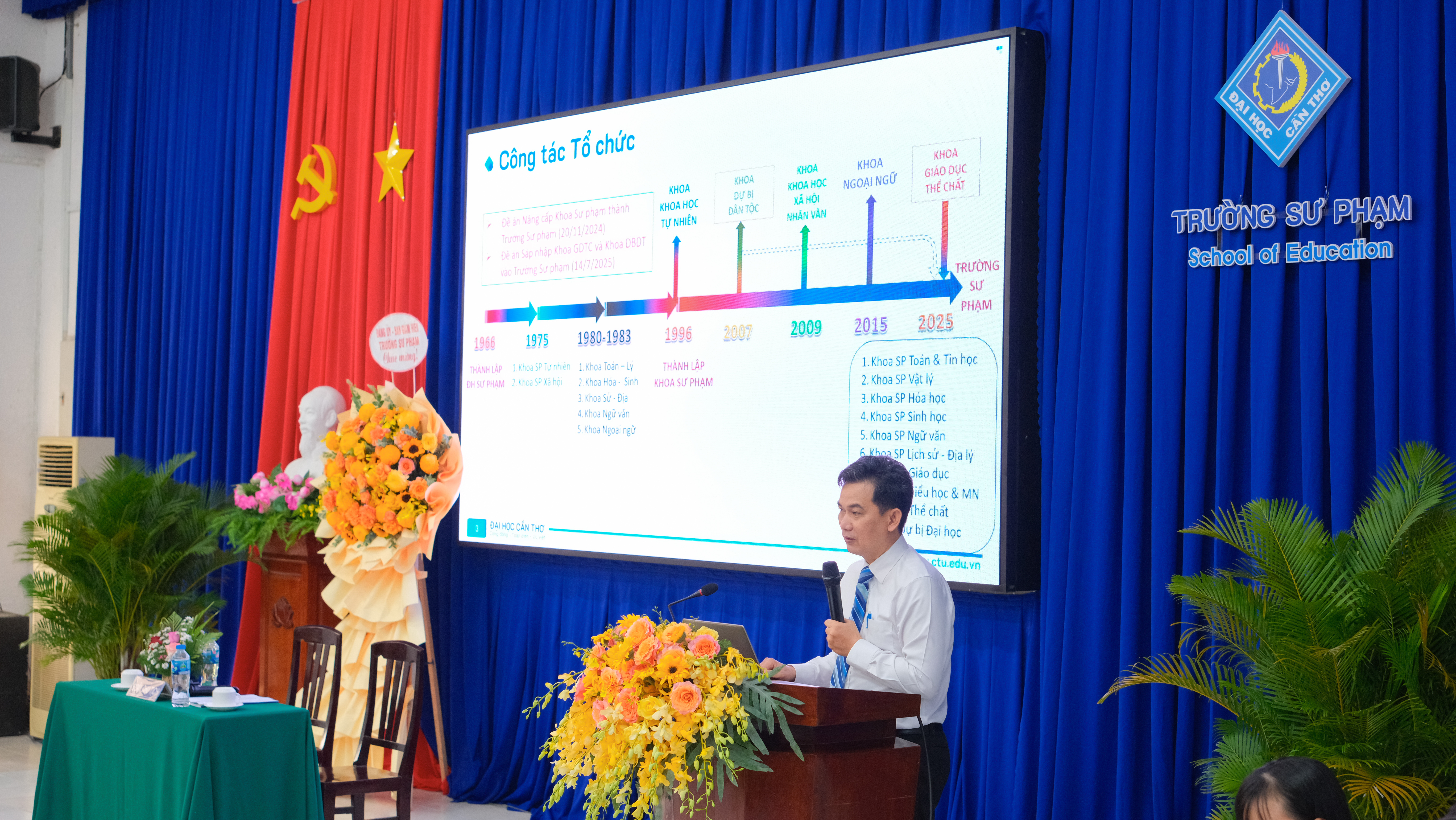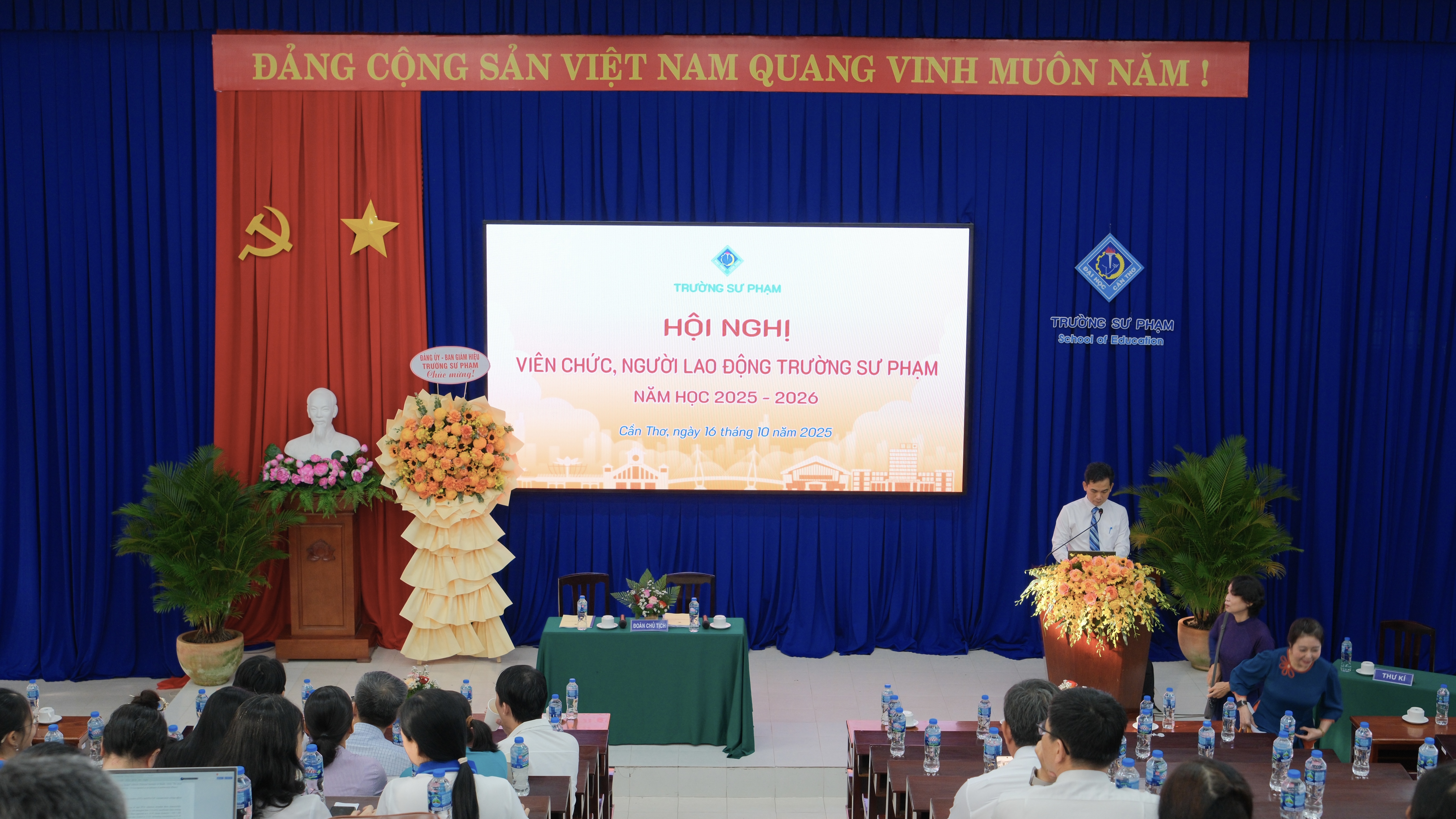 Ngày 16 tháng 10 năm 2025, Trường Sư phạm đã trang trọng tổ chức Hội nghị Viên chức, Người lao động (VC, NLĐ) năm học 2025-2026. Sự kiện trọng yếu này không chỉ là hoạt động thường niên mà còn là một diễn đàn dân chủ trực tiếp, thể hiện vai trò làm chủ tập thể của đội ngũ cán bộ, giảng viên, nhân viên, cùng nhau hoạch định chiến lược và quyết tâm thực hiện thắng lợi các mục tiêu phát triển trong bối cảnh đổi mới căn bản và toàn diện giáo dục. Hội nghị diễn ra dưới sự chủ trì và định hướng chiến lược của PGS.TS. Huỳnh Anh Huy, Hiệu trưởng Trường Sư phạm, cùng các thành viên trong Đoàn Chủ tịch. Với vai trò người đứng đầu, Hiệu trưởng Huỳnh Anh Huy đã trực tiếp trình bày Báo cáo Tổng kết công tác năm học 2024-2025, đánh giá toàn diện những thành tựu đạt được, đồng thời đưa ra Phương hướng, nhiệm vụ trọng tâm và các chỉ tiêu thi đua then chốt cho năm học 2025-2026, nhấn mạnh tầm nhìn và chiến lược phát triển của Trường trong giai đoạn mới.